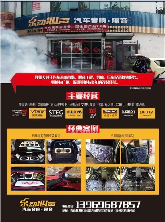 青島開發(fā)區(qū)樂動心聲汽車音響·隔音店2016年11月11日正式開業(yè),開業(yè)期間,一律7.8折,還有四款特價優(yōu)惠套餐送給大家,到店即送價值40元高品質(zhì)試音碟一張。 我們專注于汽車音響改裝、隔音 ...