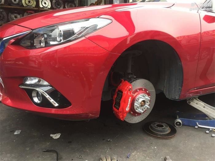 昂克賽拉 升級二手brembo f50 大四活塞鮑魚 特斯拉拆車 搭配355mm打孔劃線分體盤 18寸原裝輪轂 加裝 15毫米法蘭盤 現(xiàn)場作業(yè) 更多改裝案例請加wx:wlovewyz