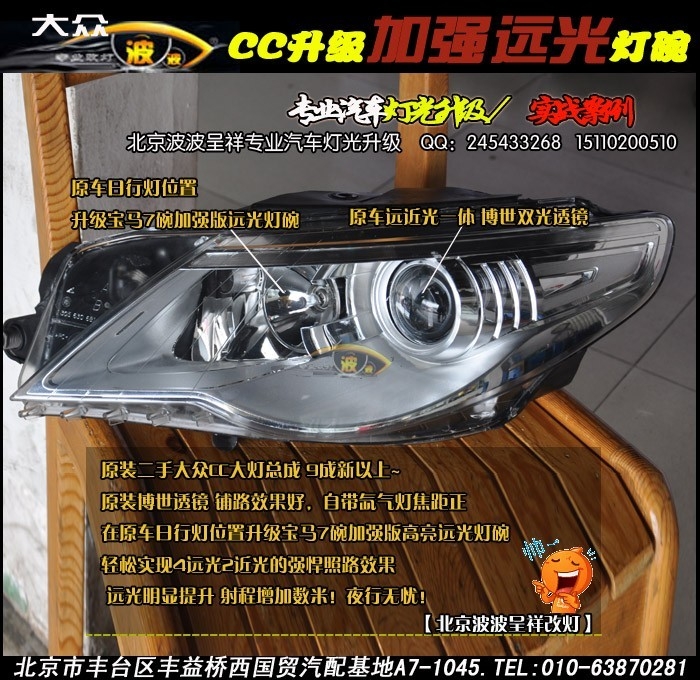 大眾CC升級原廠二手高配大燈 保定專業(yè)改燈 專業(yè)的技工師傅改裝,技術(shù)嫻熟。無破壞的原裝位改裝即可擁有高配車氙氣燈的外觀和高亮燈光電話:15110200510QQ:245433268 本店市面上有的透鏡基本上都有車 ...